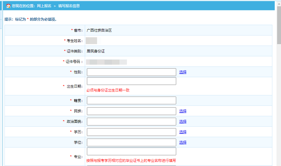 第二步:點擊“注冊”,進(jìn)入考生注冊頁面,考生注冊填寫個人信息