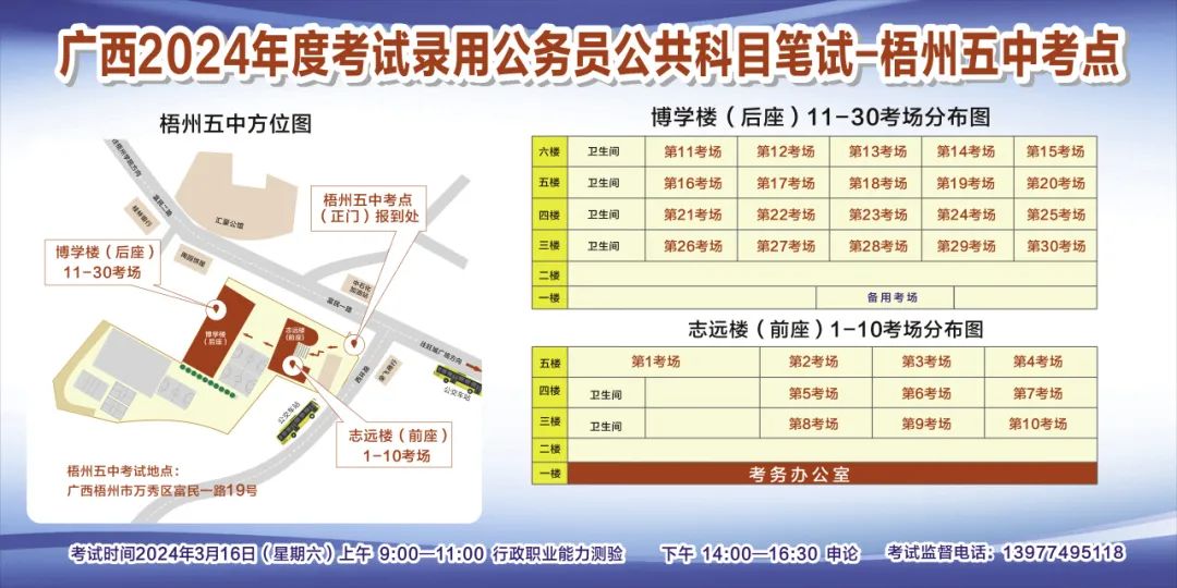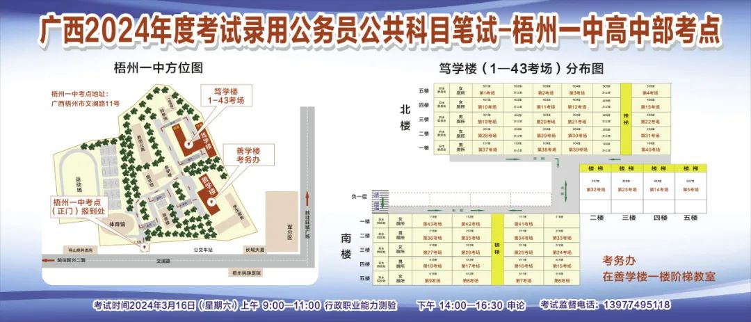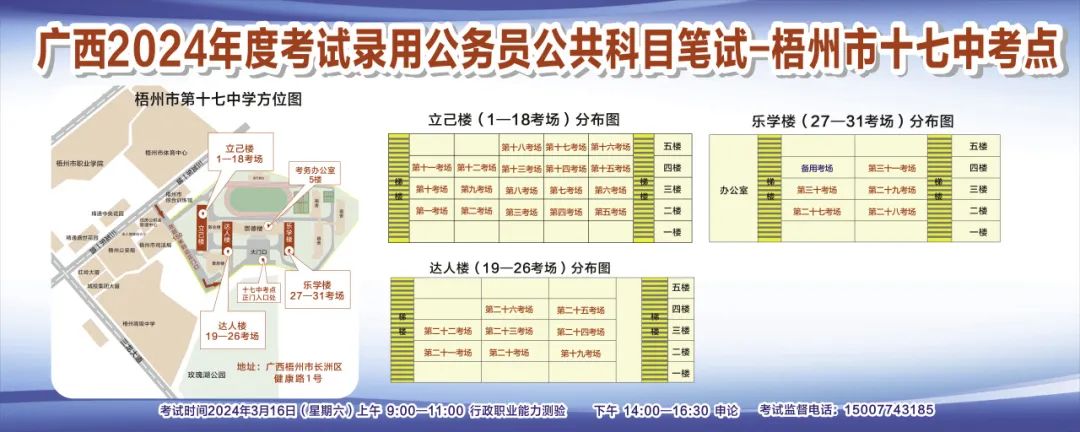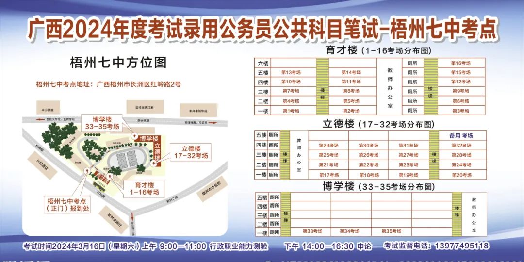一、廣西2024年度考試錄用公務員(選調(diào)生)公共科目筆試將于3月16日舉行,梧州考區(qū)共設置9個考點,請考生提前熟悉各自考點位置、周邊環(huán)境及交通情況,考試當天提前出門做好準備,準時參加考試。特別提示:因考點停車場地有限,所有考生車輛不得進入考點,請考生規(guī)劃好前往考點的交通方式和路線。