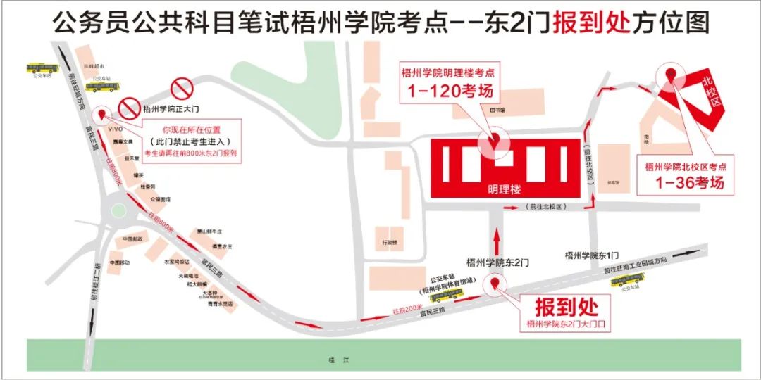 公交車參考:乘坐10路、32路、49路、49路延長線、蒼梧城鄉(xiāng)6路到梧州學院體育館站,下車后步行約200米到達梧州學院東大門。考生統(tǒng)一在梧州學院東大門進入,考點門口處于交通干道,送考車輛只能在東門外短暫停留,梧州學院南門及其他門無法核驗考生身份。從東大門進入明理教學樓考點考場步行約5分鐘,進入北校區(qū)教學樓考點考場步行約15分鐘,請規(guī)劃好進入考點時間。