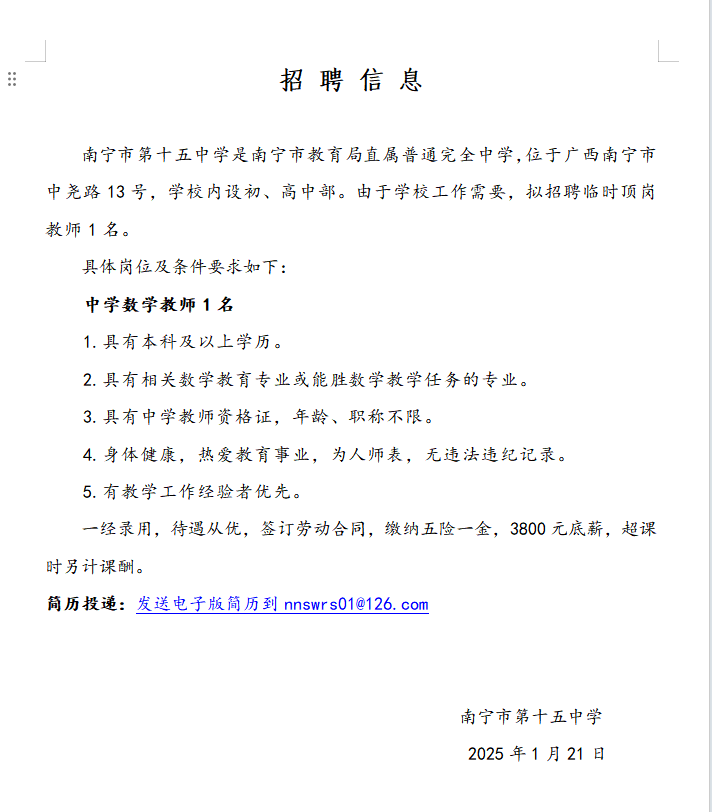 2025年南寧市第十五中學招聘中學數(shù)學老師1名