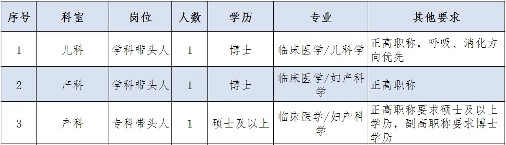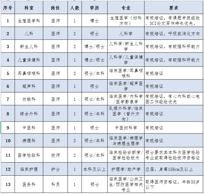 (4)其他情況,年齡要求:初級(jí)職稱不超過30歲、中級(jí)職稱不超過35歲、副高職稱不超過45歲,正高職稱不超過50歲;醫(yī)師崗位要求四證齊全,即畢業(yè)證、學(xué)位證、醫(yī)師資格證、規(guī)培證齊全。