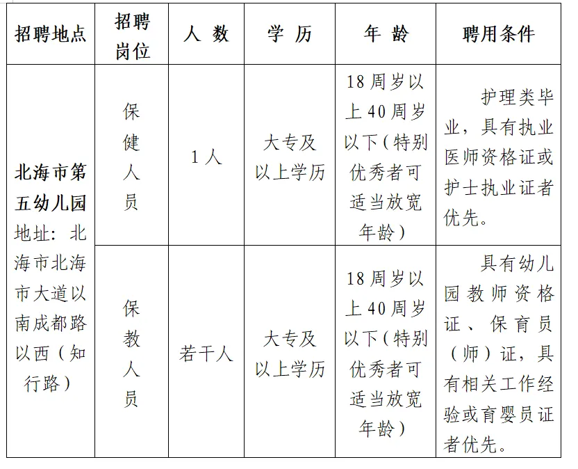 2025年3月北海市第五幼兒園聘用人員招聘若干人