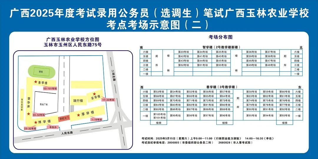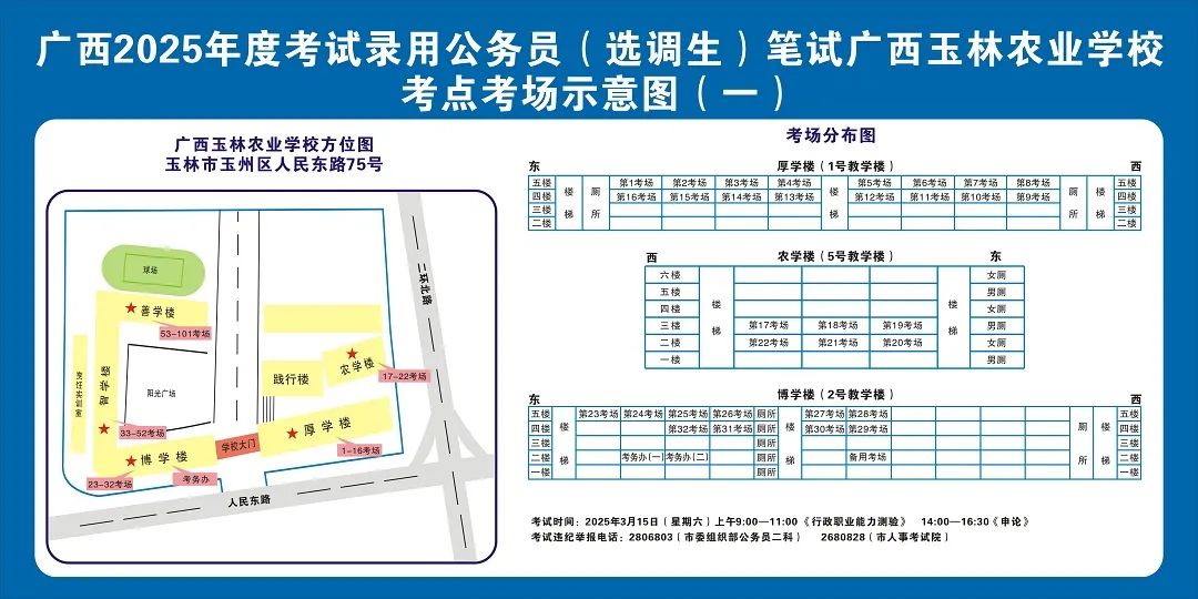 廣西2025年度考試錄用公務員(選調生)筆試將于3月15日舉行,為進一步提升玉林考區(qū)服務保障質量,現(xiàn)就有關注意事項提示如下,請廣大考生做好應試準備工作,準確掌握考試時間、考點地址及相關注意事項。