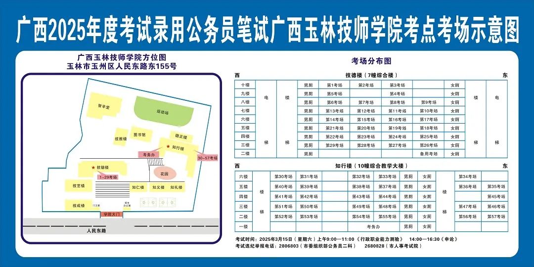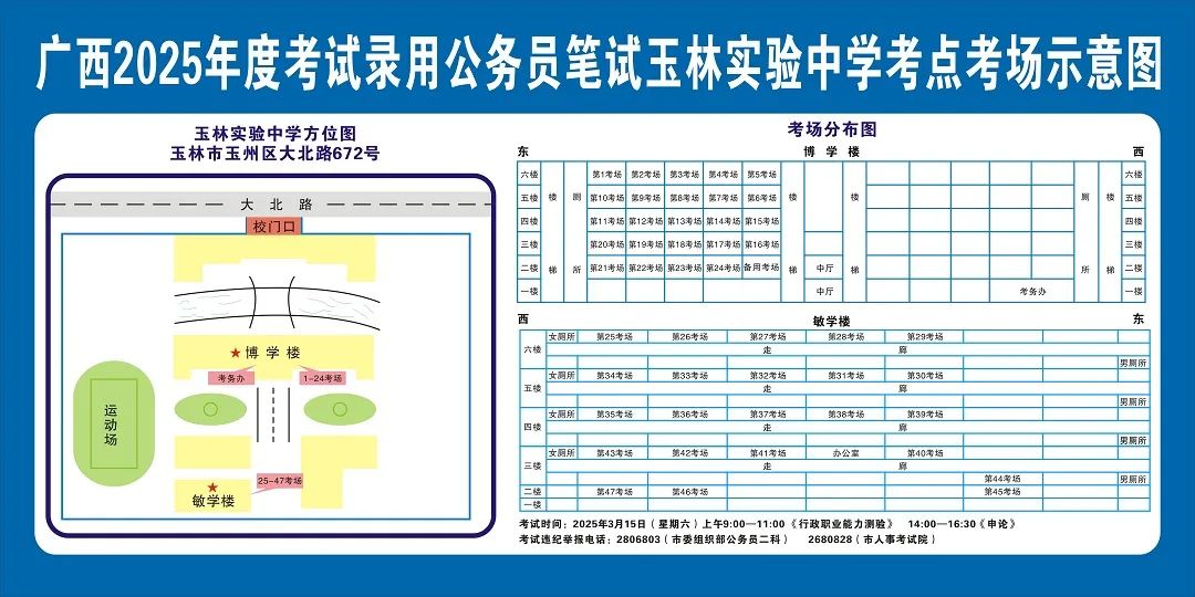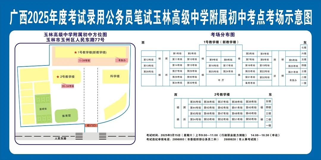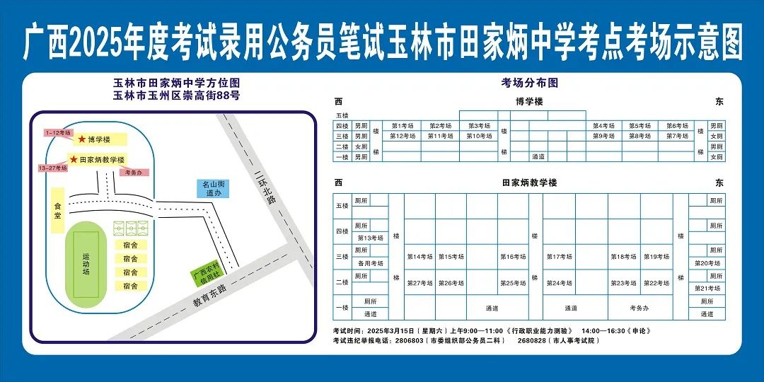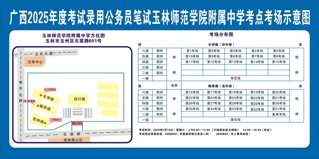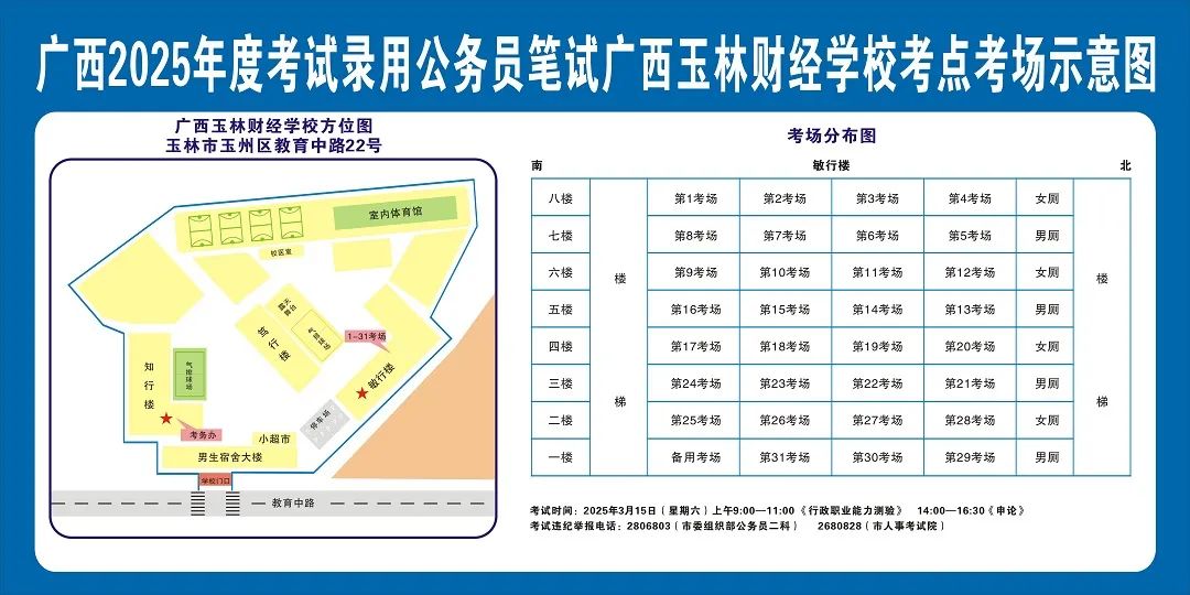 除考試當天考生可以進入考點外,考生不得提前進入考點查看考場(學校將在大門處擺放考場分布示意圖),玉林考區(qū)11個考點的考場布置情況如下: