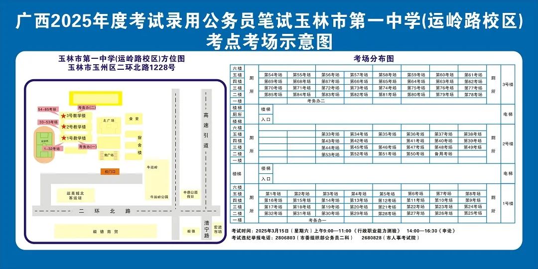 玉林市第一中學(運嶺路校區(qū))考點11:00-12:00,16:30-17:30 在考點安排公交車和值勤人員,負責將考生接送到玉林汽車總站。