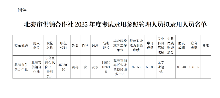 北海市供銷合作社2025年度考試錄用參照管理人員擬錄用人員公示