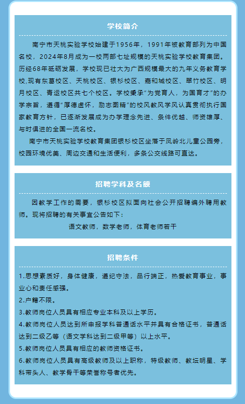 南寧市天桃實(shí)驗(yàn)學(xué)校教育集團(tuán)銀杉校區(qū)2025年外聘教職工招聘公告