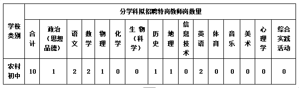 德保縣2025年計劃招聘初中特崗教師10名,具體科目計劃招聘人數詳見下表: