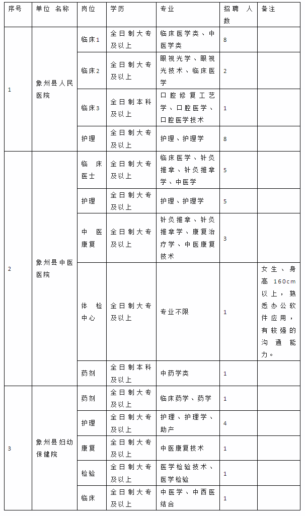 因工作需要,根據(jù)相關規(guī)定,我單位擬面向社會公開招聘見習人員42名,其中象州縣人民醫(yī)院19人、象州縣中醫(yī)醫(yī)院15人、象州縣婦幼保健院8人?,F(xiàn)將有關事項通知如下:
