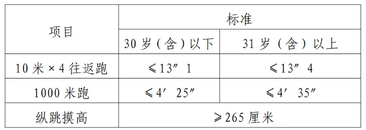 體能測(cè)評(píng)項(xiàng)目中,縱跳摸高的測(cè)試次數(shù)不超過3次,10米×4往返跑測(cè)評(píng)次數(shù)為2次,1000米/800米的測(cè)評(píng)次數(shù)均為1次。應(yīng)聘勤務(wù)崗位的人員,體能測(cè)評(píng)三項(xiàng)全部達(dá)標(biāo)的方為合格;應(yīng)聘文職崗位的人員,體能測(cè)評(píng)三項(xiàng)有兩項(xiàng)達(dá)標(biāo)的,視為合格。