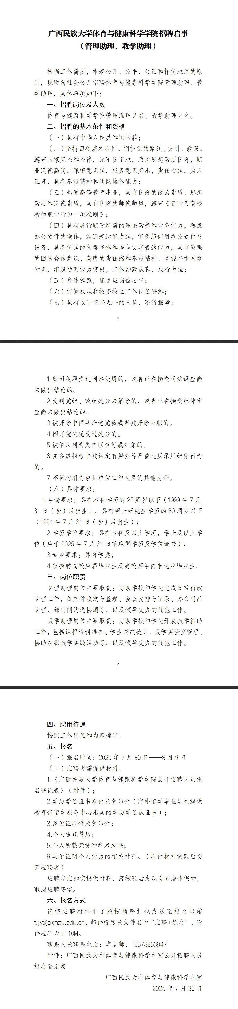 2025年廣西民族大學(xué)體育與健康科學(xué)學(xué)院招聘啟事 (管理助理、教學(xué)助理)