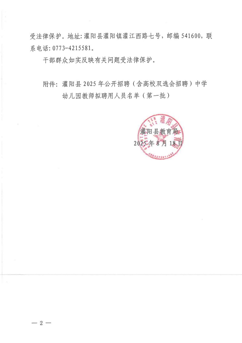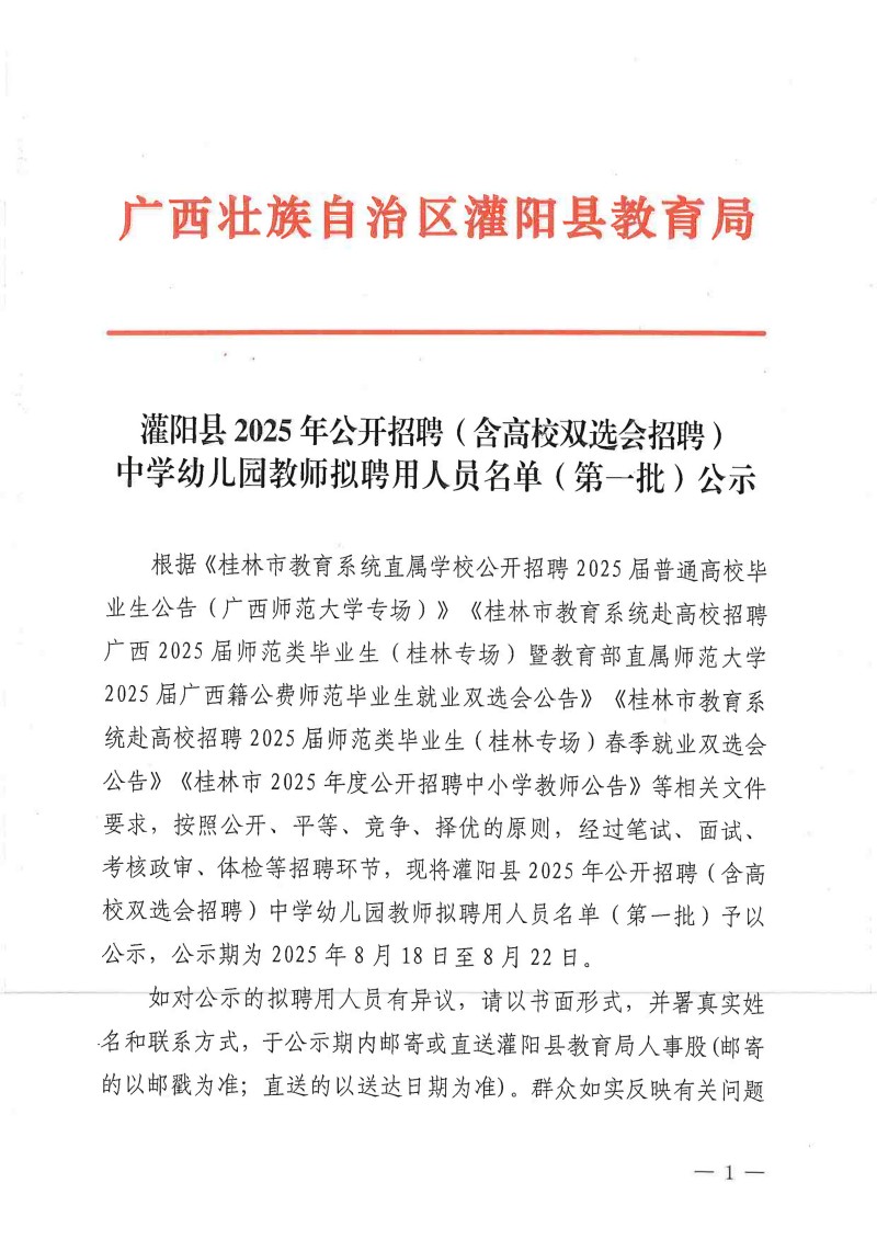原文標(biāo)題:灌陽縣2025年公開招聘(含高校雙選會招聘)中學(xué)幼兒園教師擬聘用人員名單(第一批)公示