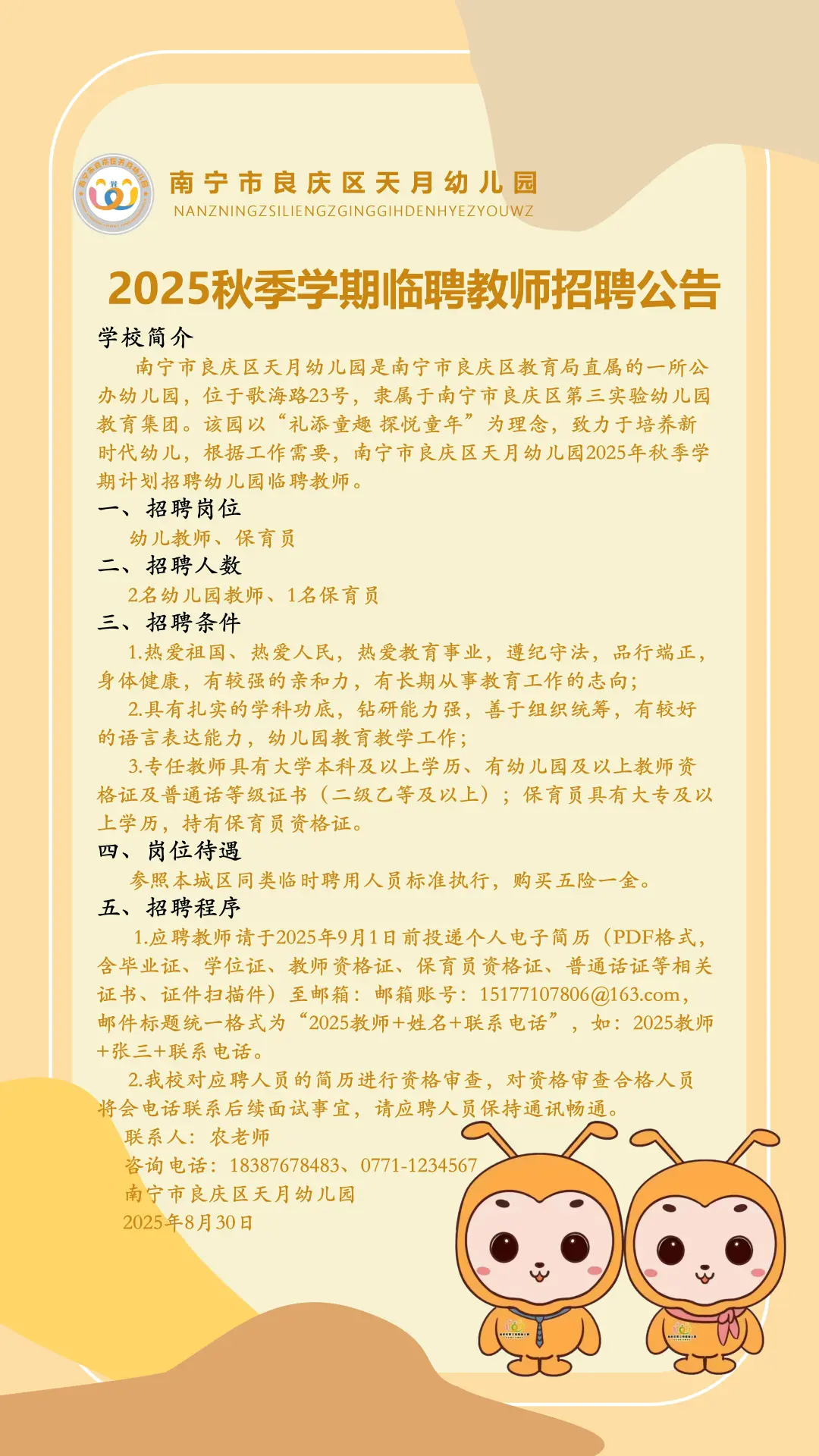2025年南寧市良慶區(qū)天月幼兒園秋季學(xué)期臨聘教師招聘公告
