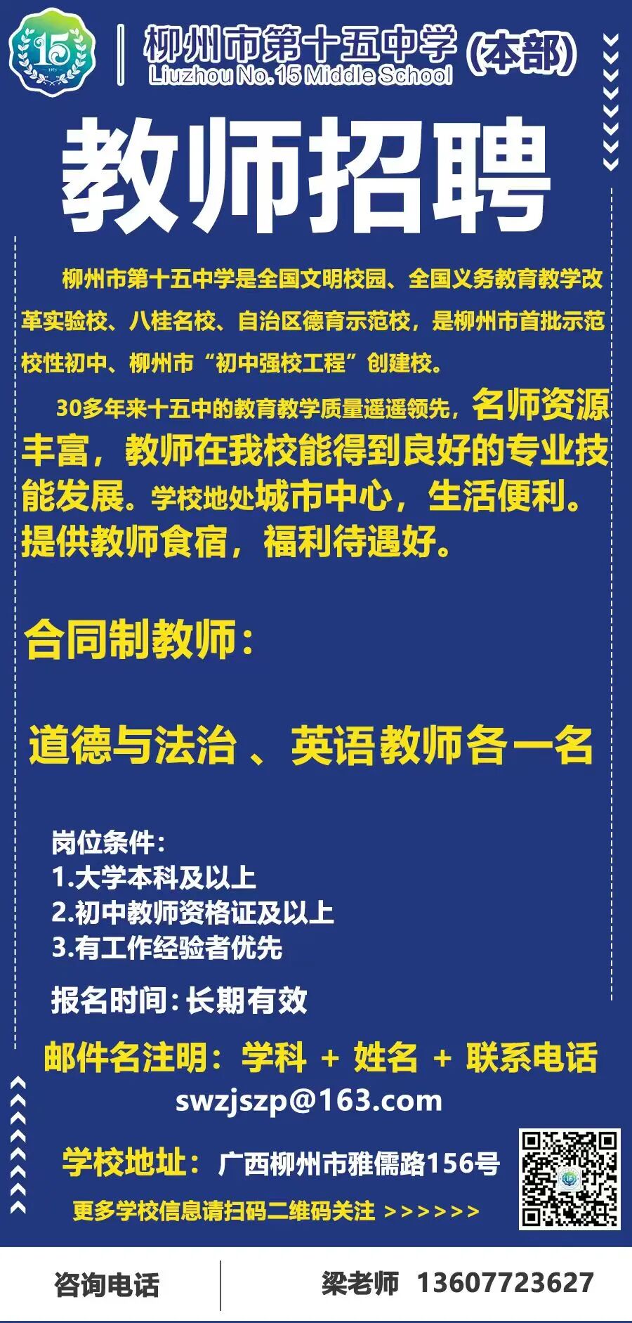 原文標題:柳州市第十五中學(xué)本部招聘公告