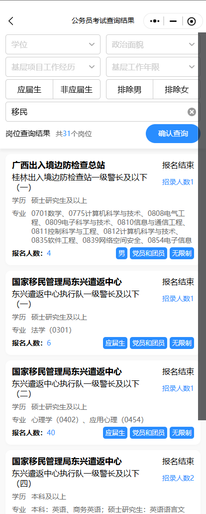 如駐廣西移民管理機(jī)構(gòu)崗位,在公考天眼輸入【移民】可查出2025年國考廣西崗位中,有31個(gè)崗位信息↓