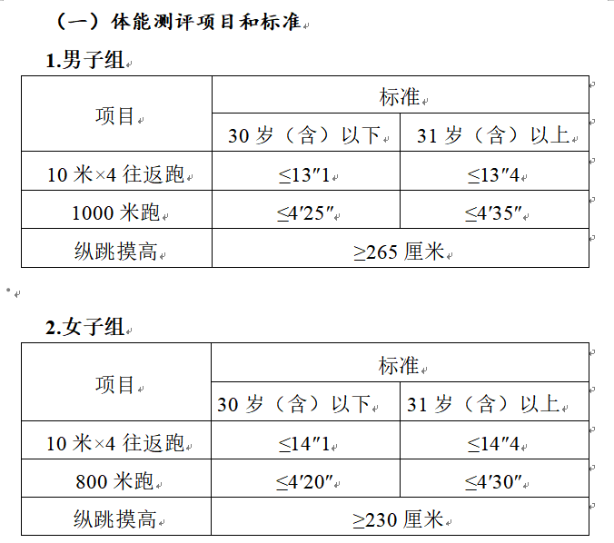 測評結(jié)果分為合格和不合格。一般體能測評三項(xiàng)成績均達(dá)標(biāo)的方為合格,其中具有研究生及以上學(xué)歷報(bào)考人員,體能測評三個(gè)項(xiàng)目中有任兩項(xiàng)達(dá)標(biāo)的,即視為合格。