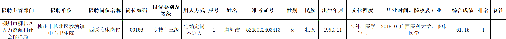 根據(jù)《柳州市2025年度下半年事業(yè)單位公開(kāi)考試招聘工作人員公告》要求及安排,唐劉潔同志經(jīng)面試、考察、體檢合格,符合聘用條件。經(jīng)研究決定,擬聘用唐劉潔同志為我區(qū)事業(yè)單位工作人員,現(xiàn)予以公示,公示期為5個(gè)工作日(2026年1月22日至2026年1月28日)。對(duì)擬聘用的同志如有異議,請(qǐng)以書面形式,并署真實(shí)姓名和聯(lián)系地址,于2026年1月28日前郵寄或直接送我單位(地址:柳州市柳北區(qū)鷓鴣江六隊(duì)南200米(北外環(huán)路南)柳北區(qū)衛(wèi)生健康局512室;郵編:545002,電話0772-2802642),群眾如實(shí)反映有關(guān)問(wèn)題受法律保護(hù)。