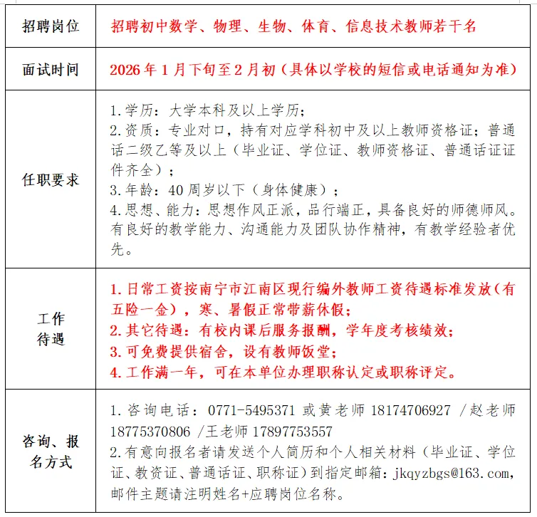 原文標(biāo)題:南寧經(jīng)濟(jì)技術(shù)開(kāi)發(fā)區(qū)第一初級(jí)中學(xué)2026年春季學(xué)期教師招聘公告