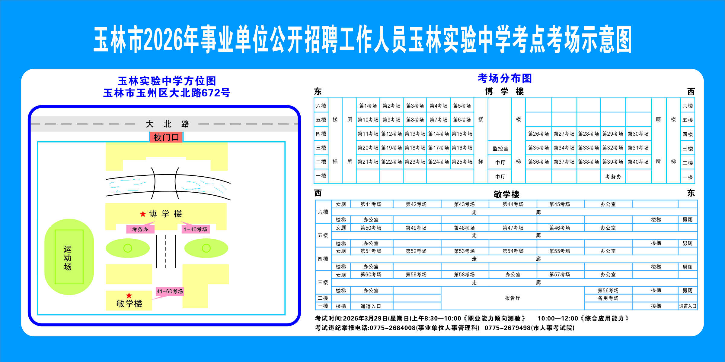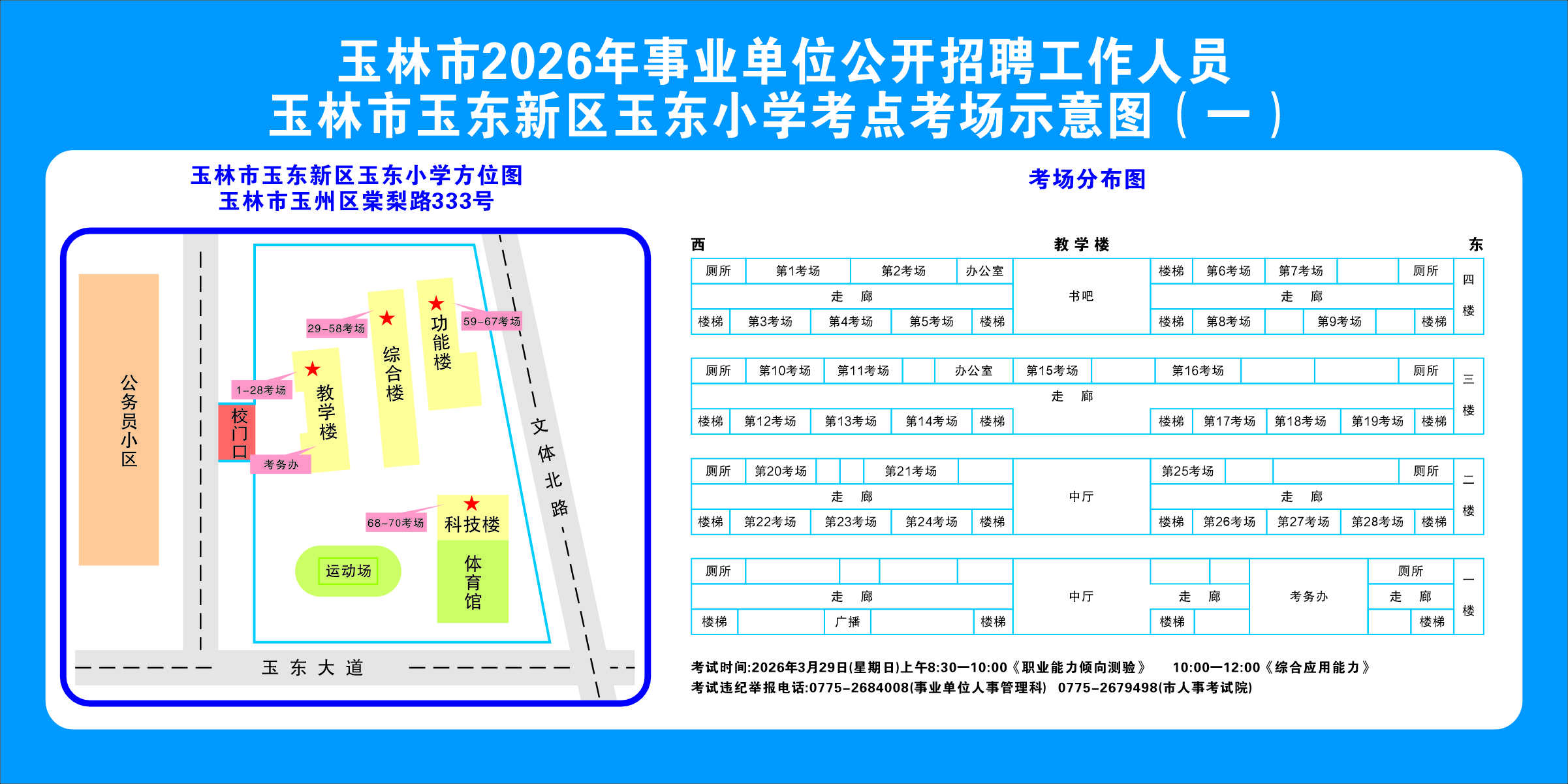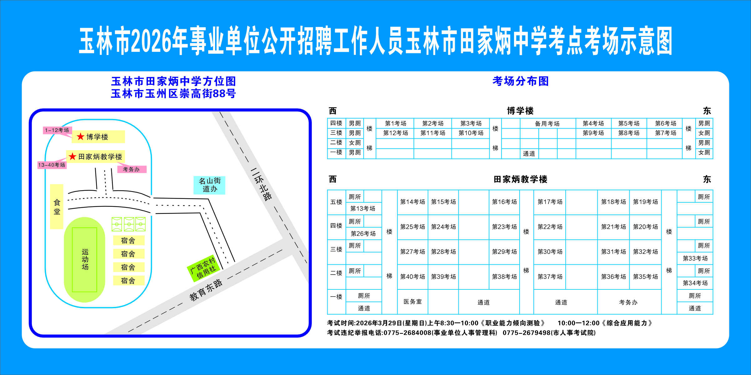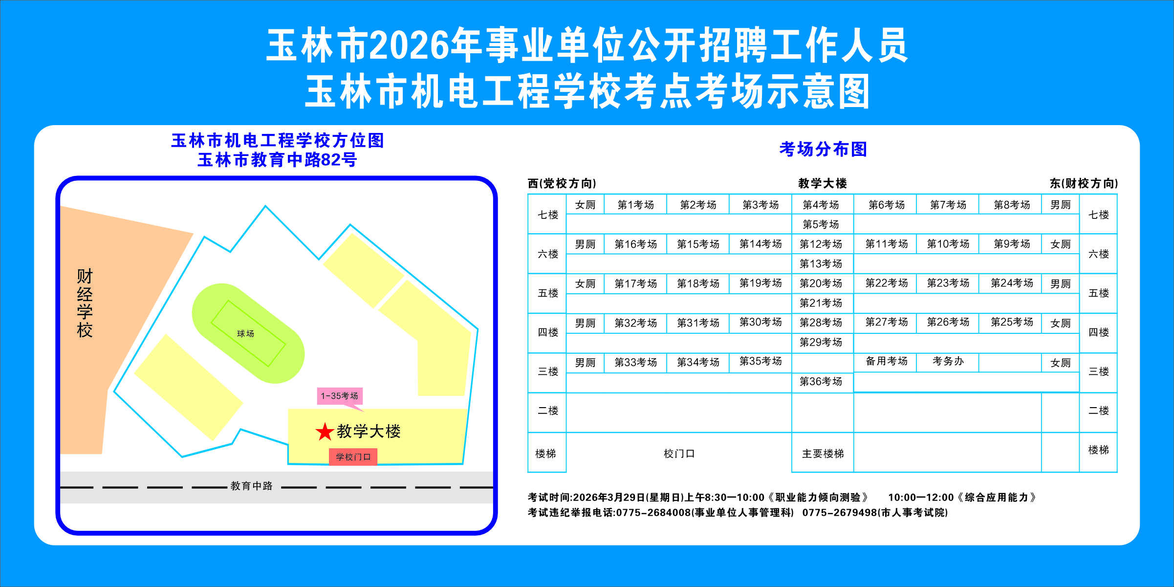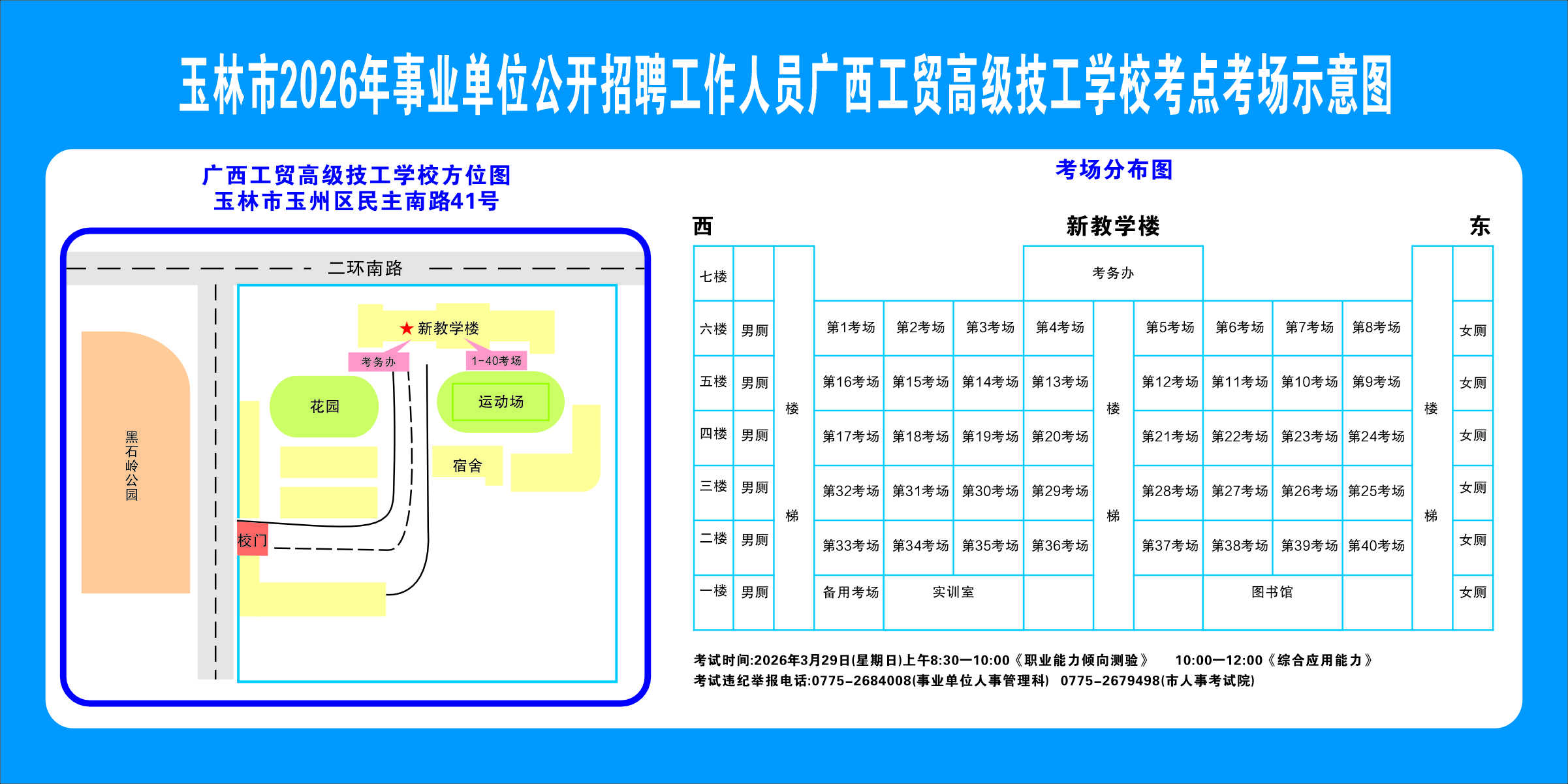 2.需要特別注意的是:玉林市第一職業(yè)中等專業(yè)學(xué)??键c(diǎn)是設(shè)在該校的東校區(qū)(人民東路東235號(hào));玉林市第一中學(xué)考點(diǎn)分為運(yùn)嶺路校區(qū)(二環(huán)北路1228號(hào))、大北路校區(qū)(大北路453號(hào))。