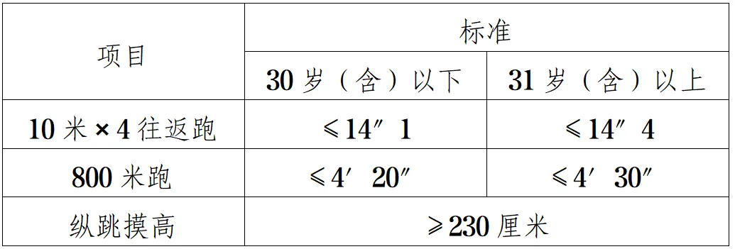 按照《關(guān)于印發(fā)〈公安機(jī)關(guān)錄用人民警察體能測(cè)評(píng)項(xiàng)目和標(biāo)準(zhǔn)〉的通知》(公政治〔2024〕60號(hào))執(zhí)行。體能測(cè)評(píng)項(xiàng)目包括10米×4往返跑、1000米(男)/800米(女)跑、縱跳摸高等3個(gè)項(xiàng)目。其中,綜合管理類(lèi)、執(zhí)法勤務(wù)類(lèi)職位測(cè)查全部3個(gè)項(xiàng)目,警務(wù)技術(shù)類(lèi)職位免予測(cè)查1000米(男)/800米(女)跑項(xiàng)目;對(duì)于專(zhuān)業(yè)人才緊缺難以形成競(jìng)爭(zhēng)的特殊職位(緊缺職位),報(bào)考人員需在參加體能測(cè)評(píng)前,從3項(xiàng)體能測(cè)評(píng)項(xiàng)目中選擇2項(xiàng)參加測(cè)試。凡應(yīng)測(cè)項(xiàng)目中任意一項(xiàng)不達(dá)標(biāo)的,即為體能測(cè)評(píng)不合格。具體如下: